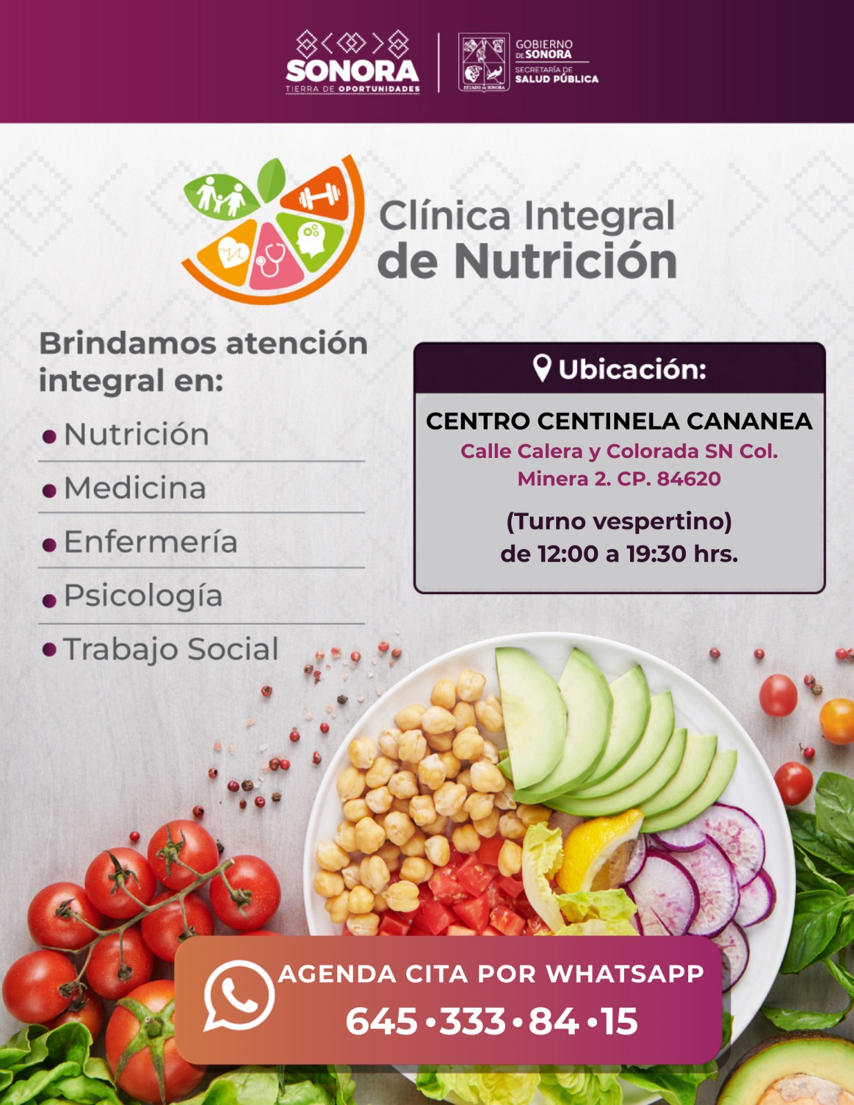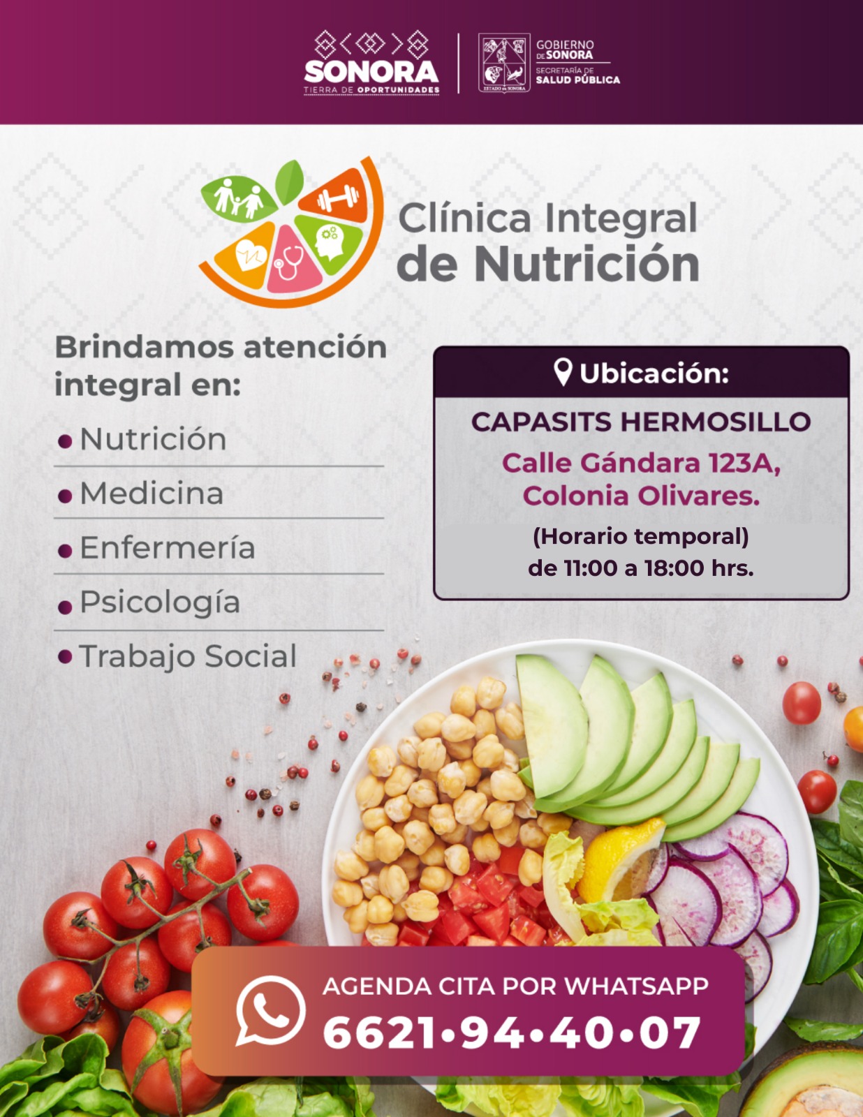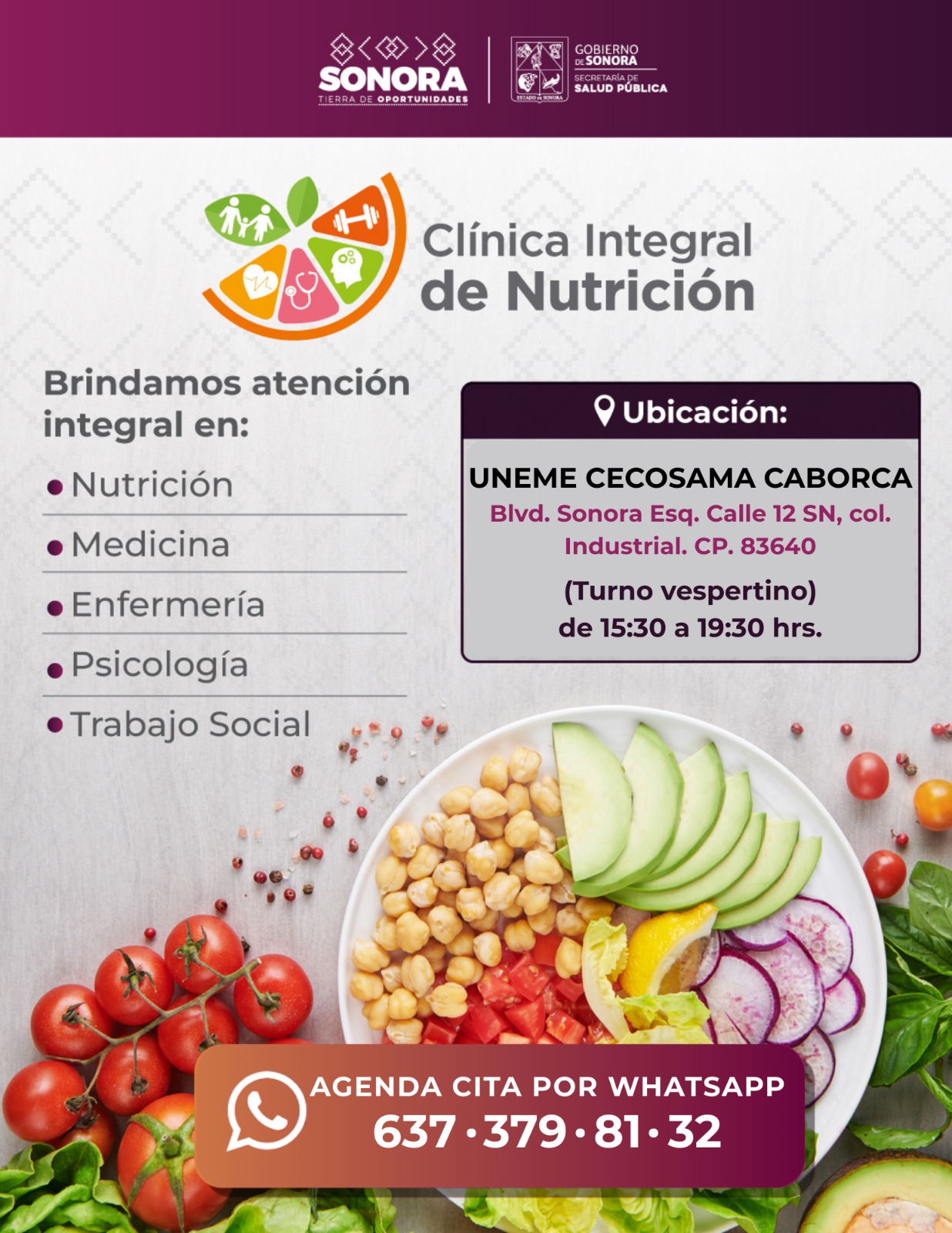 Las Clínicas Integrales de Nutrición operan en Hermosillo, Ciudad Obregón, Nogales, Caborca y Cananea, y están disponibles para todas las personas interesadas en recibir orientación profesional para el control de peso y la prevención de enfermedades asociadas, sin importar su edad o derechohabiencia.